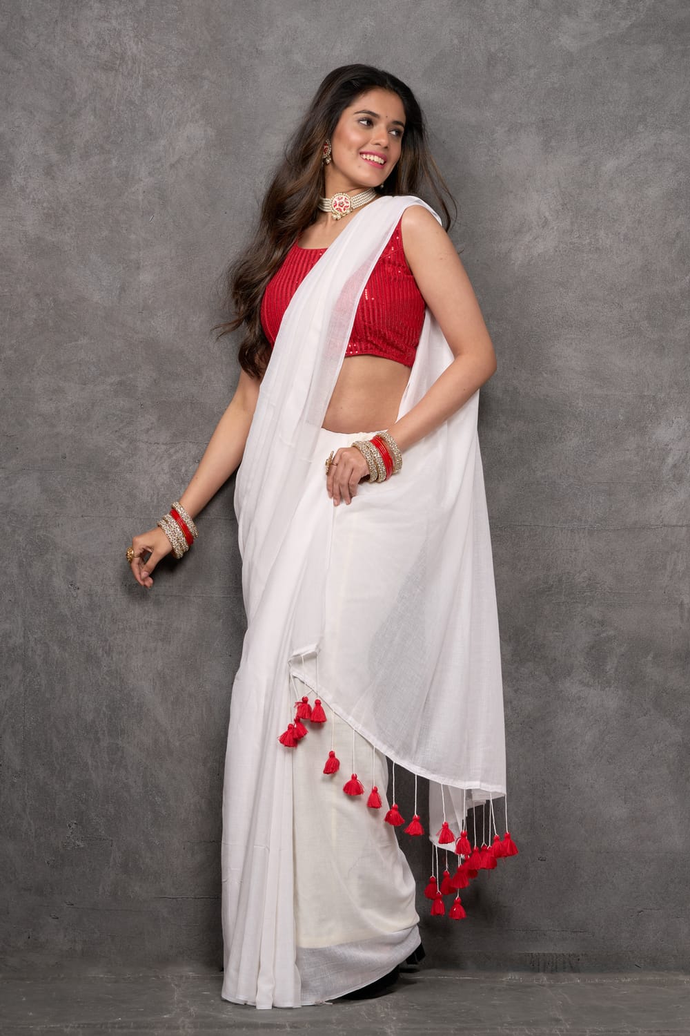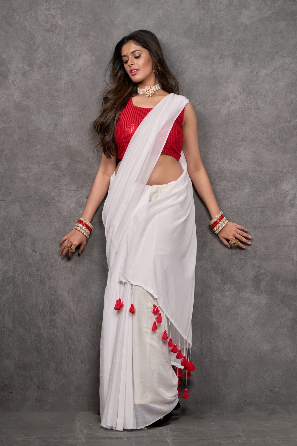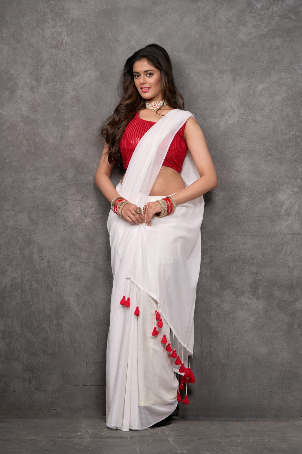 Cheerful Ivory White Mul Cotton saree with Scarlet Red tassels – a soft, breathable drape perfect for effortless elegance and everyday charm.