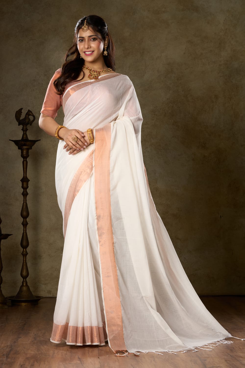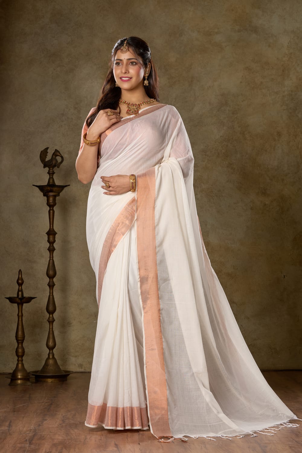 Rich Ivory Mul Cotton Saree With Copper Zari Border Saree
